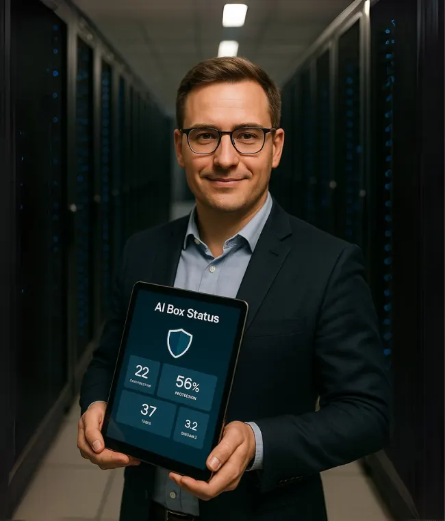 Wprowadź generatywną AI pod własny dach. AI Box działa lokalnie, więc łączy przełomową produktywność z pełną zgodnością RODO i suwerennością danych – bez ryzyka chmury i vendor-lock-in.